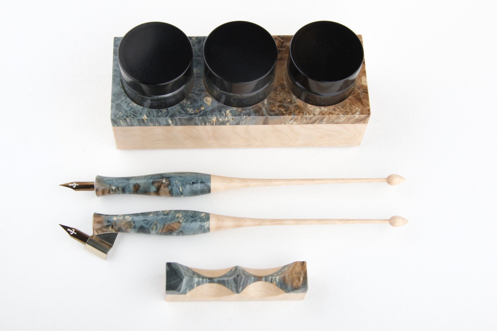 Inkwell made of stabilized Maple Burl and curly Sycamore Maple wood.