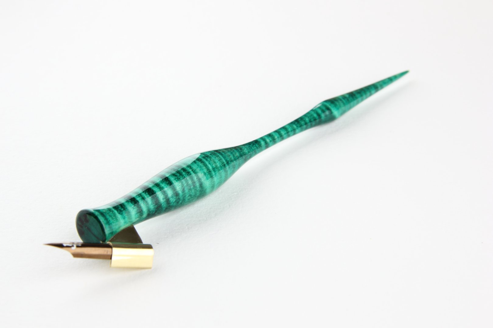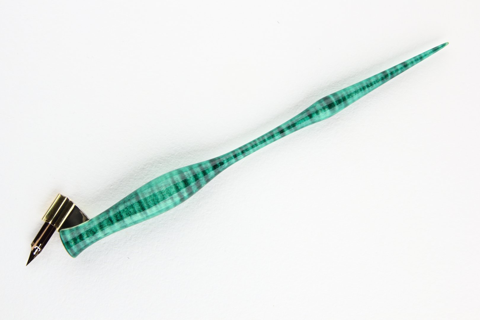 Oblique pen holder made of dyed curly Sycamore Maple wood.