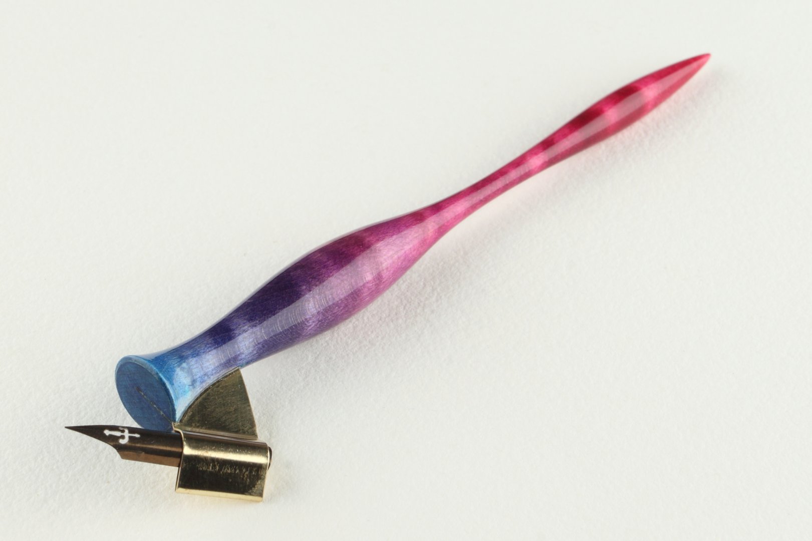 Oblique pen holder made of dyed curly Sycamore Maple wood.