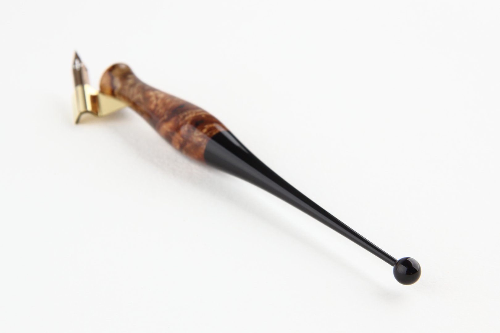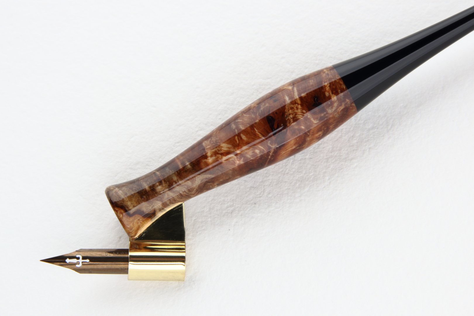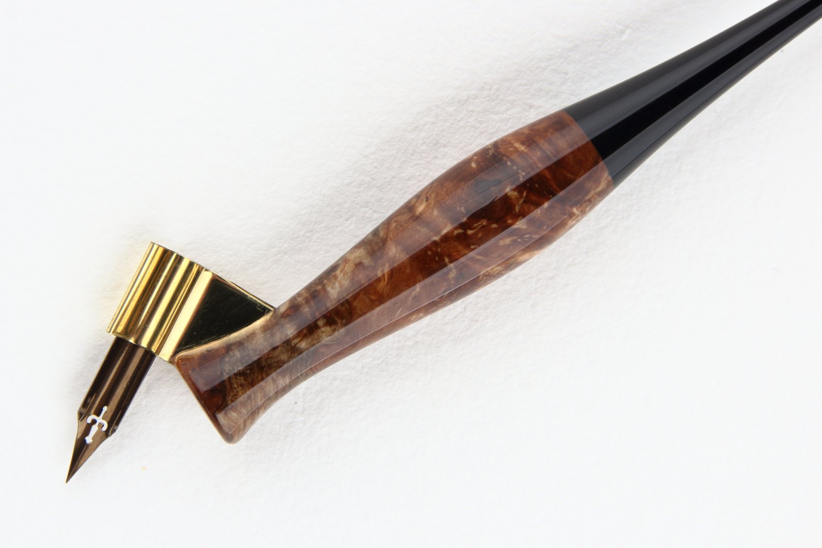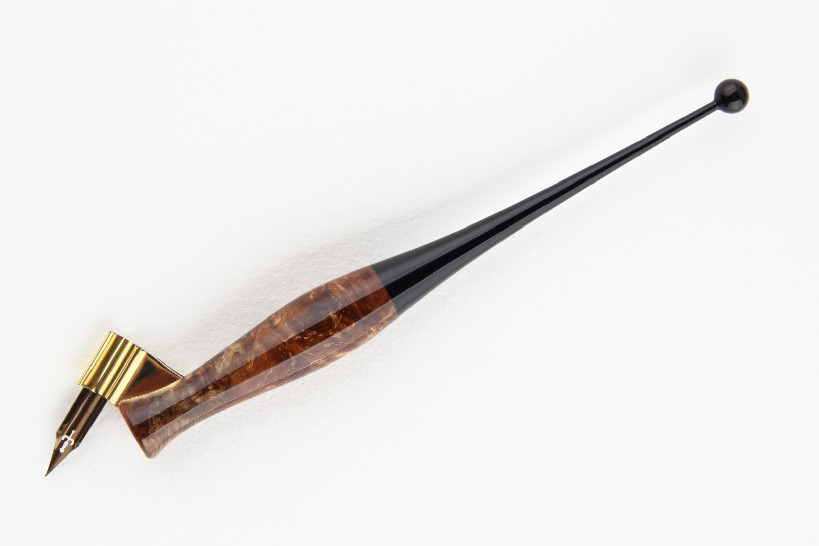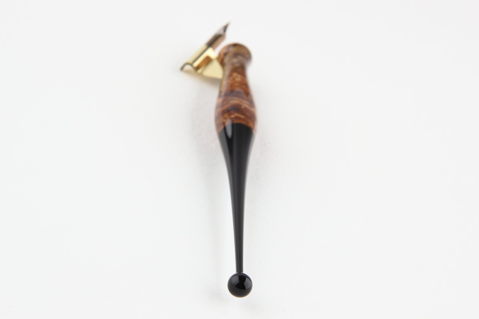 Hand crafted oblique pen holder made of stabilized Alder Burl and Gabon Ebony wood.