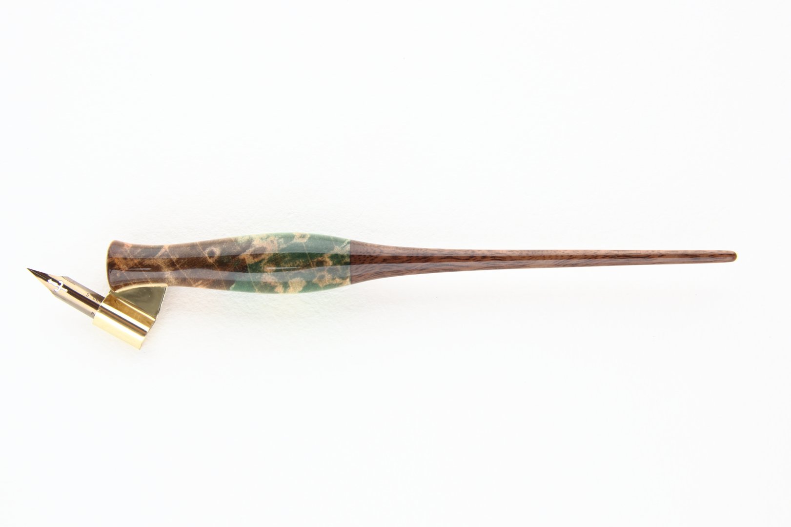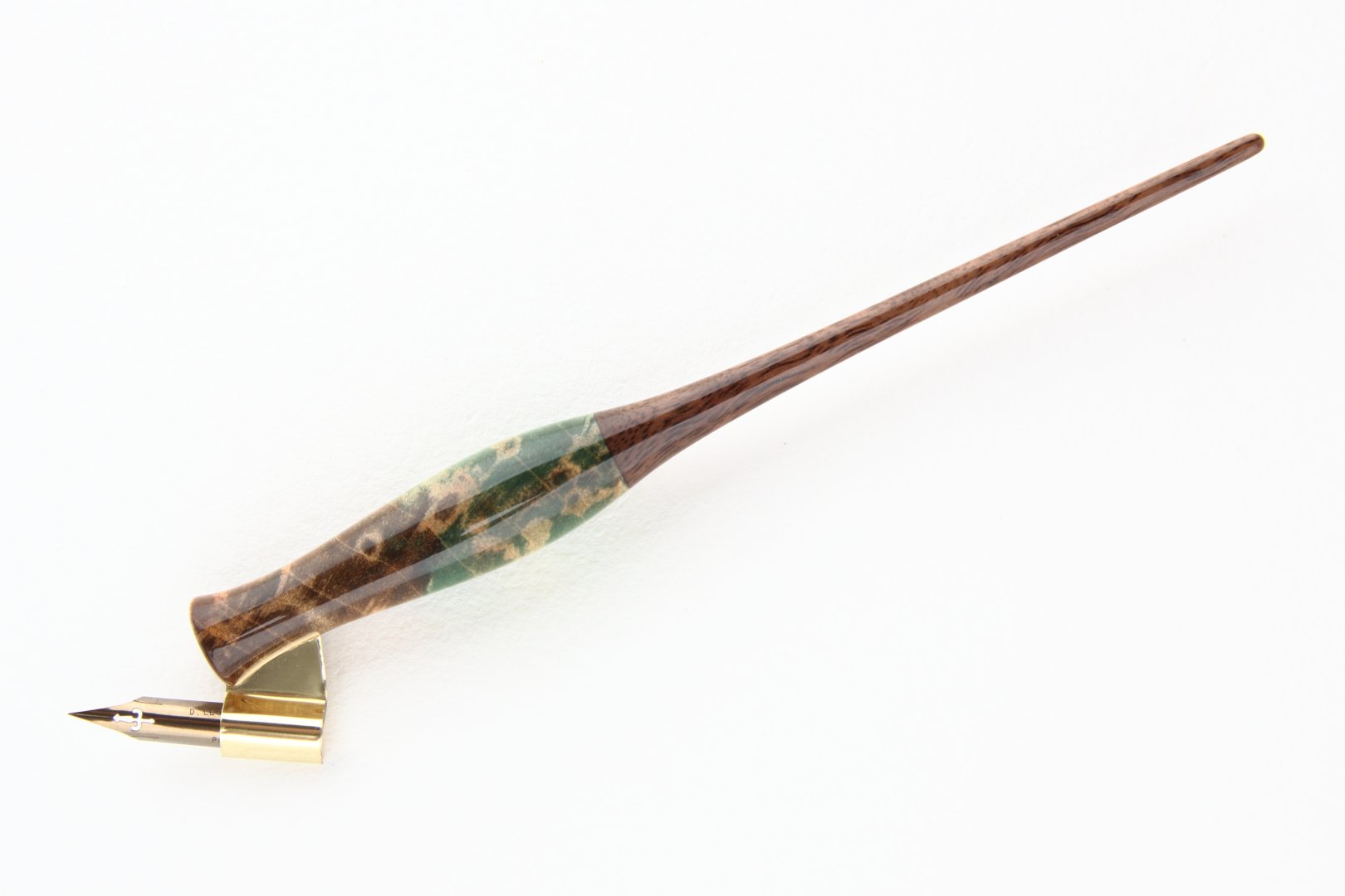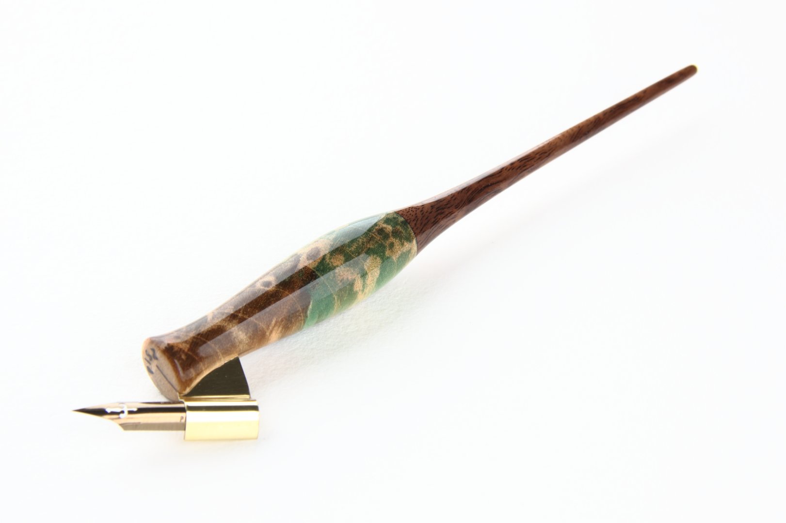 Oblique pen holder made of stabilized Maple Burl and curly American Walnut.