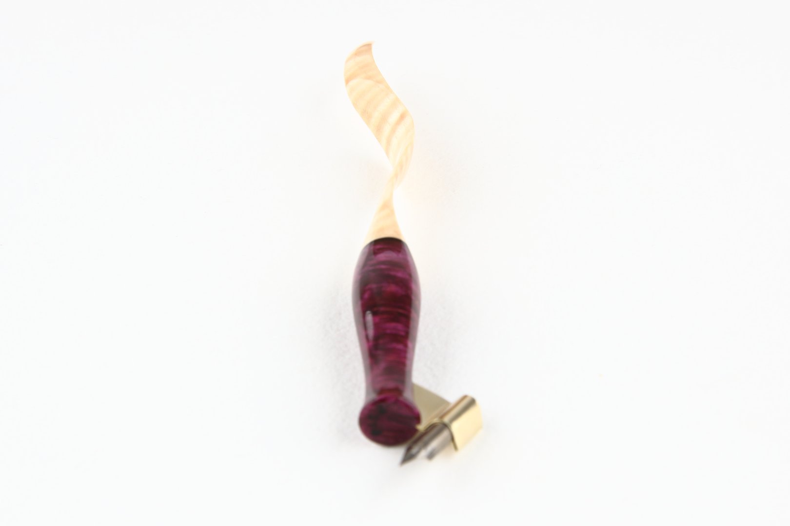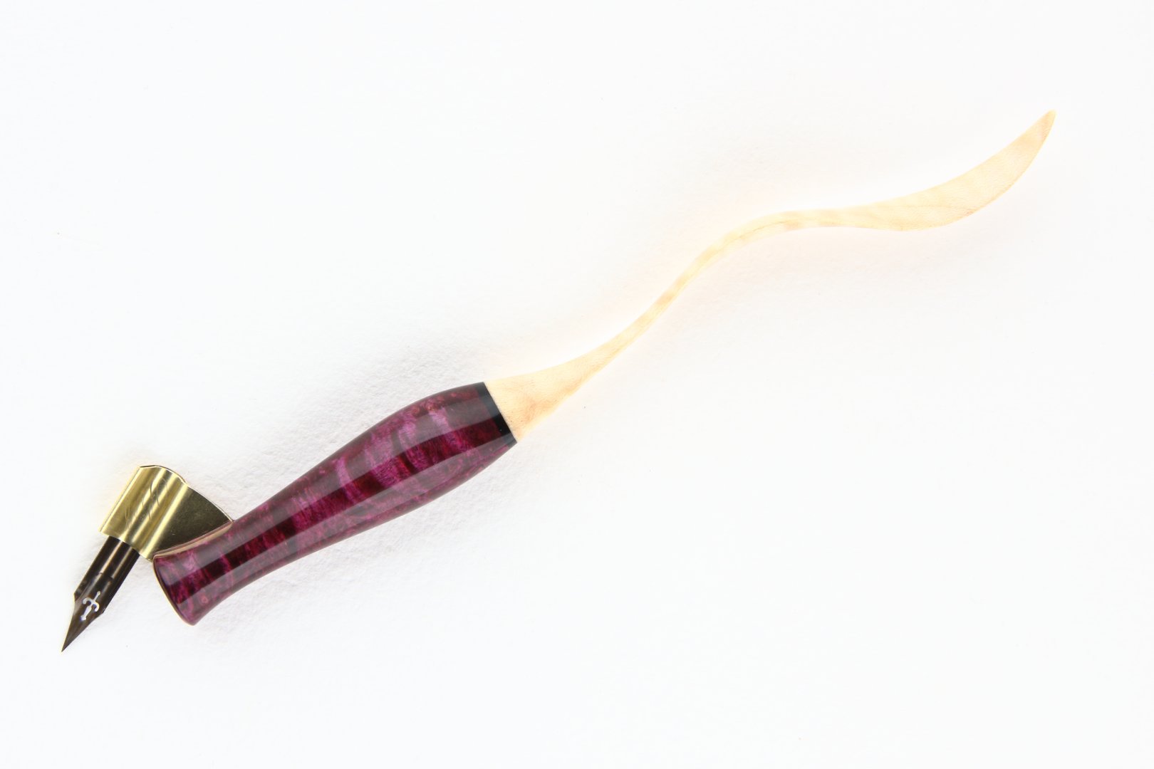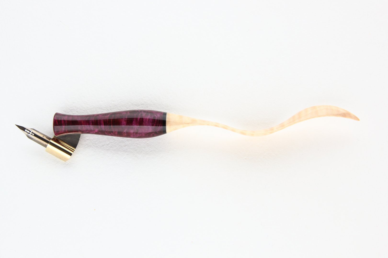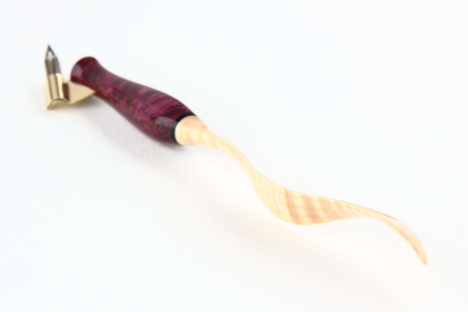 Oblique pen holder with carved tail, made of Stabilized Maple Burl, Gabon Ebony and Curly Sycamore Maple