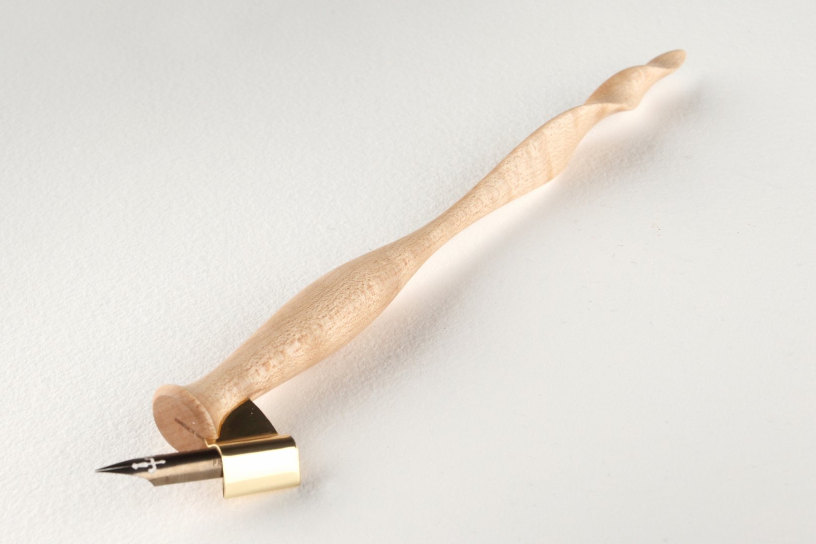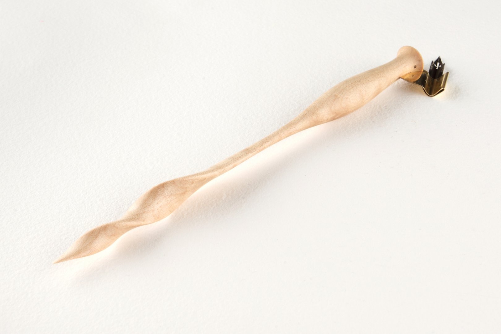 Oblique pen holder with hand carved tail, made of curly Sycamore Maple wood.