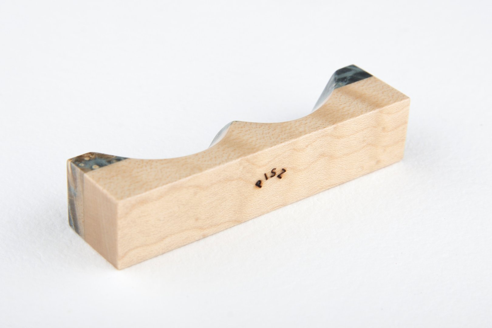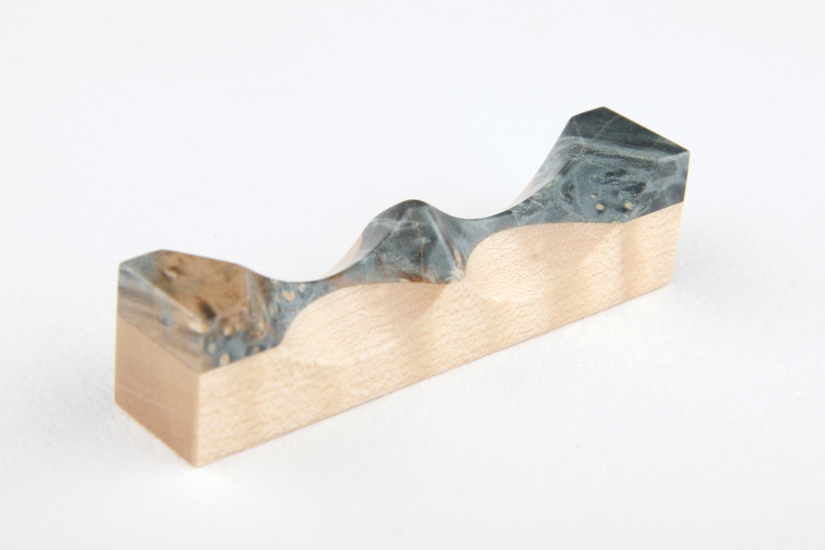 Pen rest made of stabilized Maple Burl and curly Sycamore Maple wood.