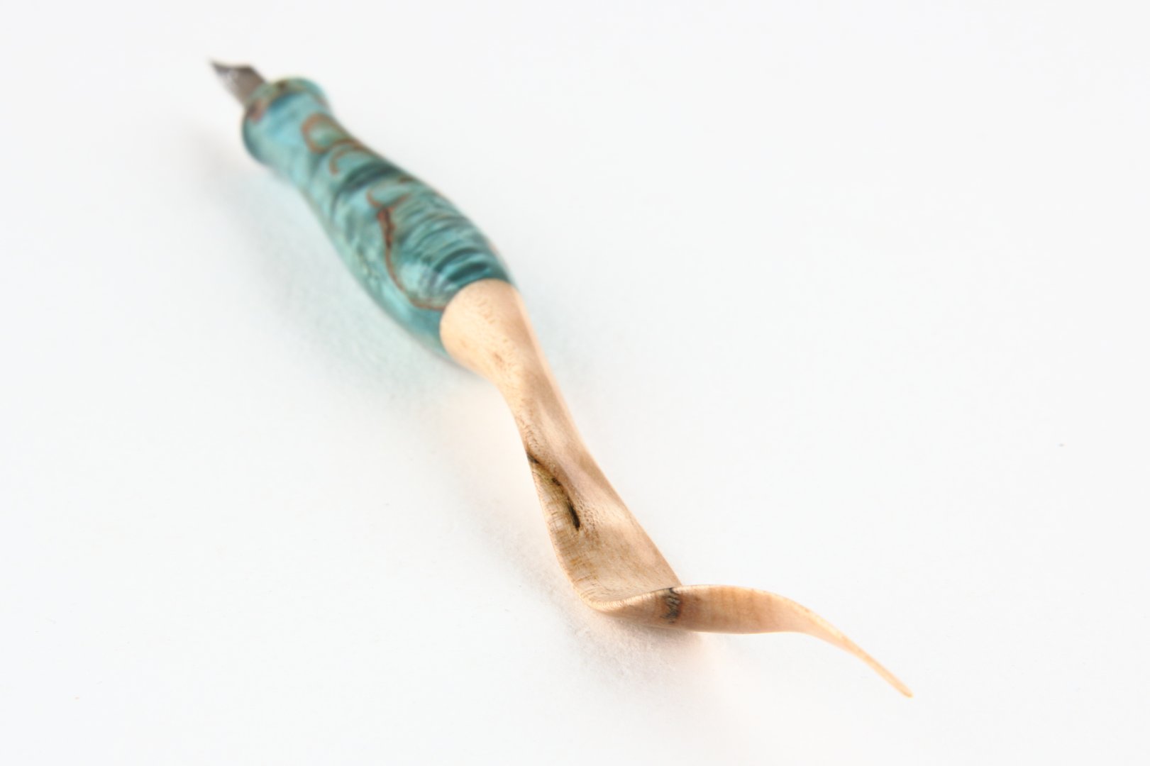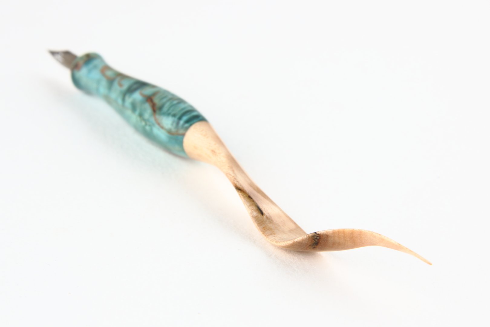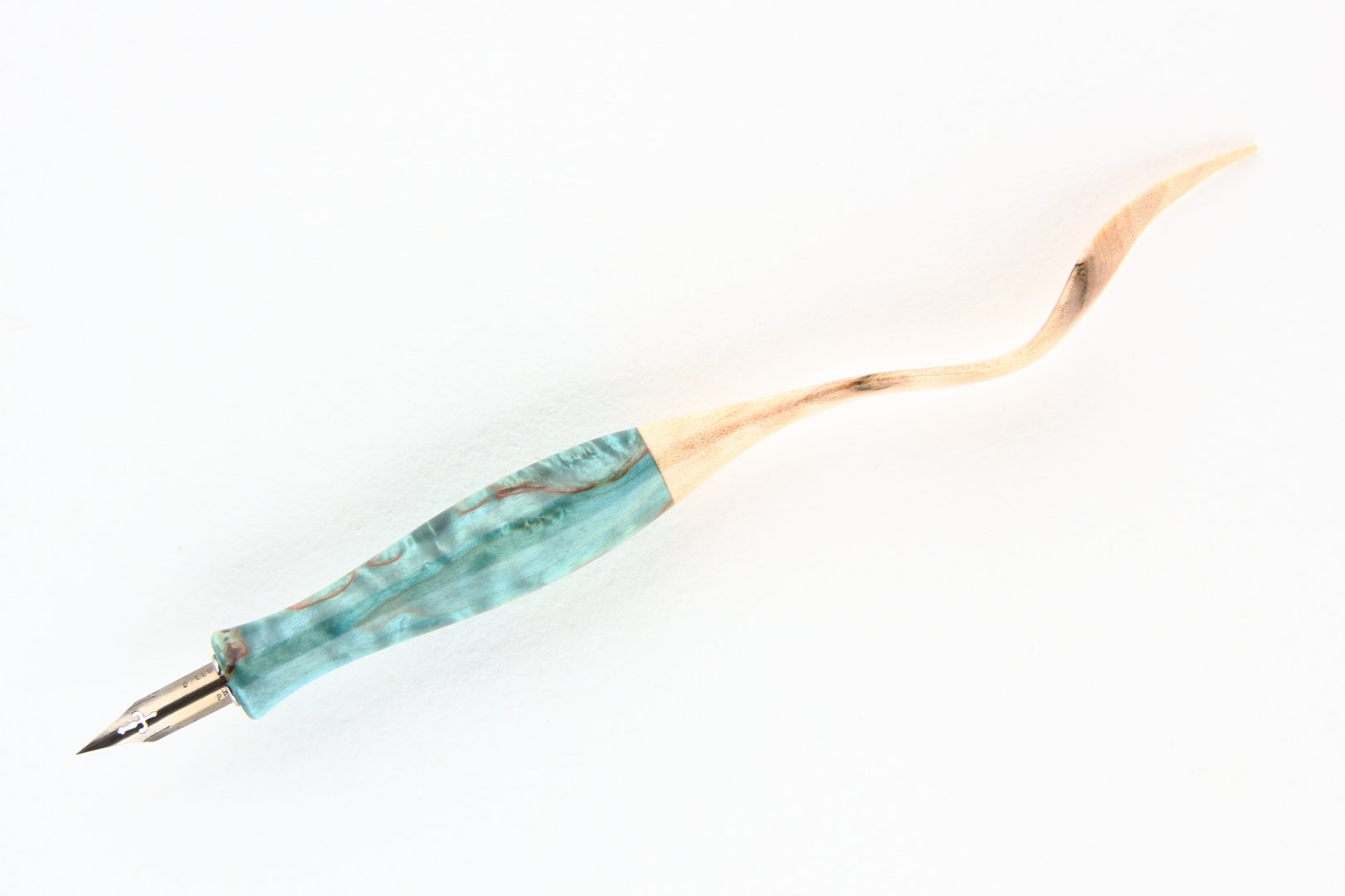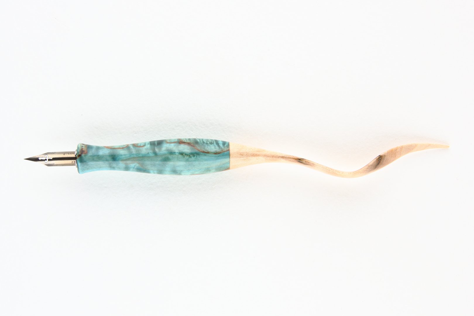 Unique straight pen holder with hand carved tail. Made of Stabilized Karelian Birch and Curly Sycamore Maple.