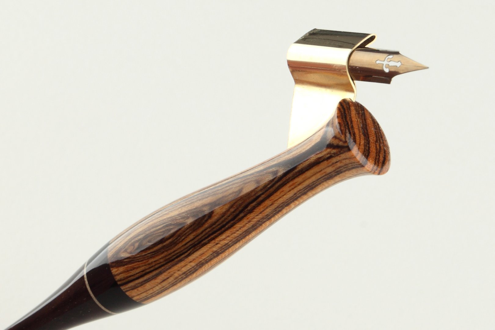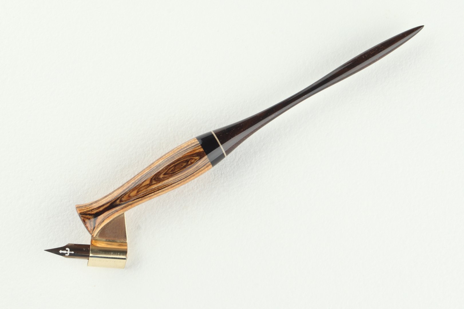 Oblique pen holder made of Bocote, Gabon Ebony and Brazilian Ebony wood, with a thin insert of Sycamore Maple wood.