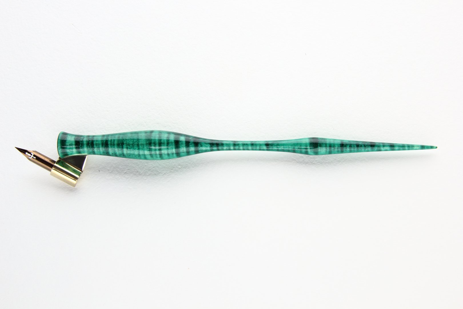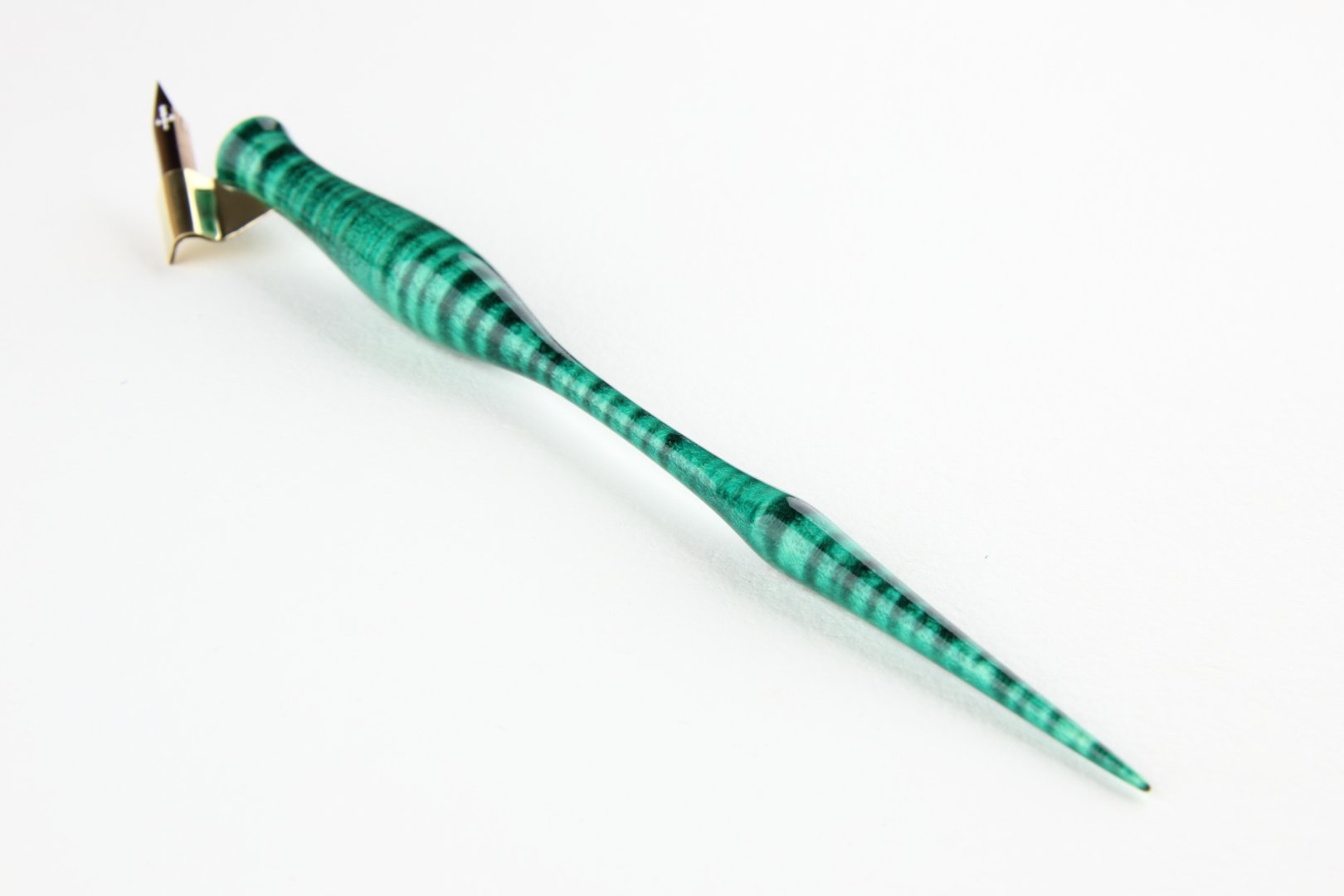 Oblique pen holder made of dyed curly Sycamore Maple wood.