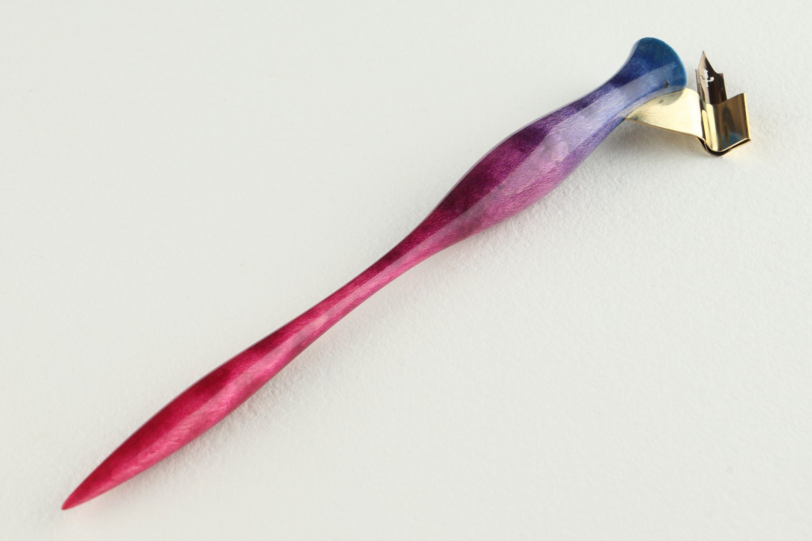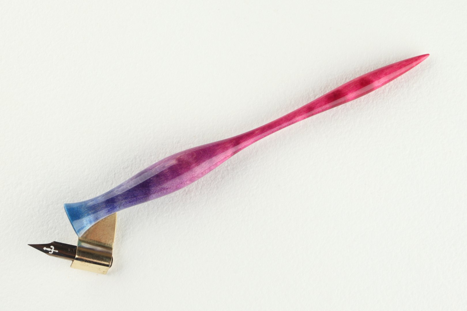 Oblique pen holder made of dyed curly Sycamore Maple wood.