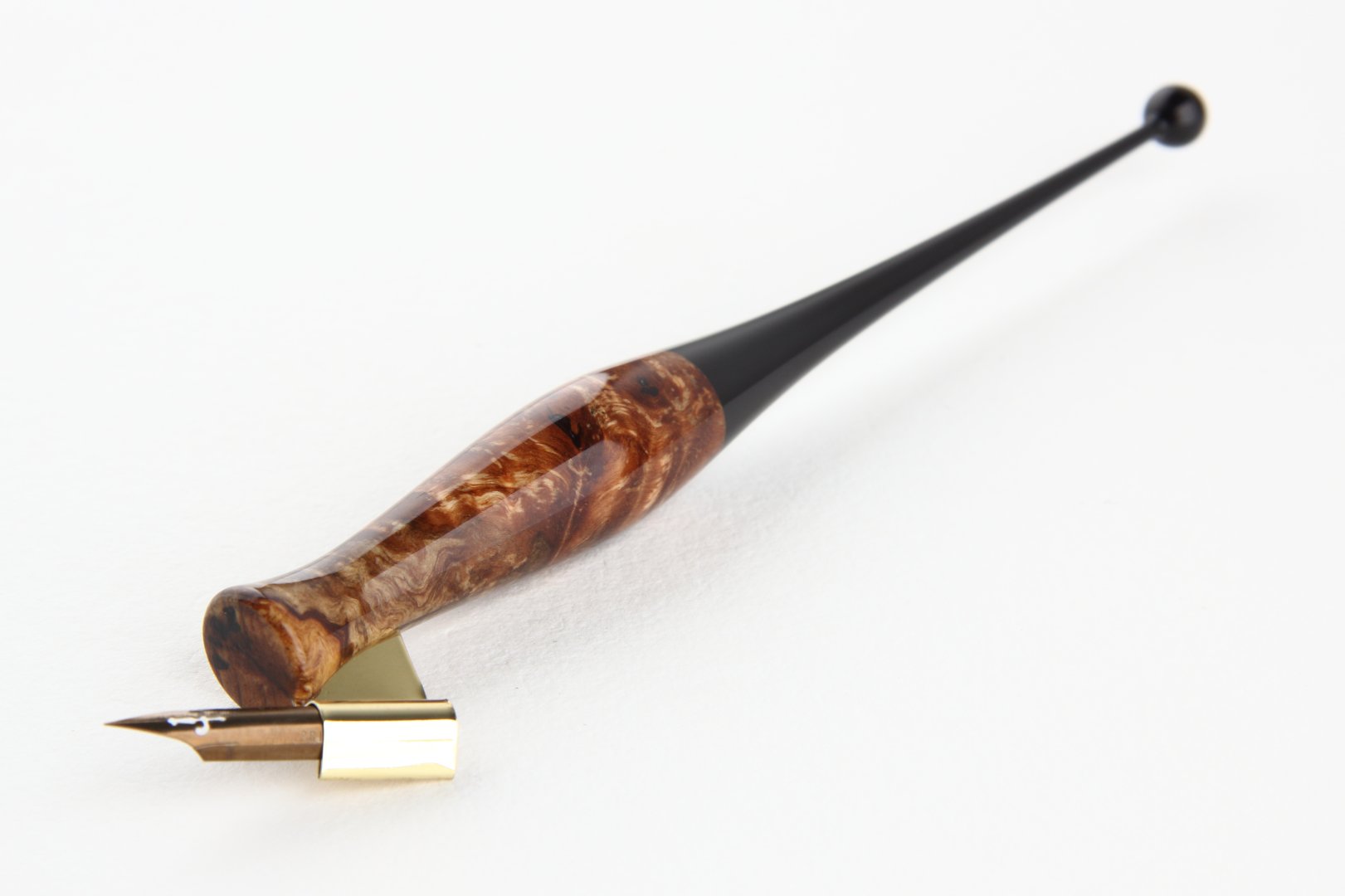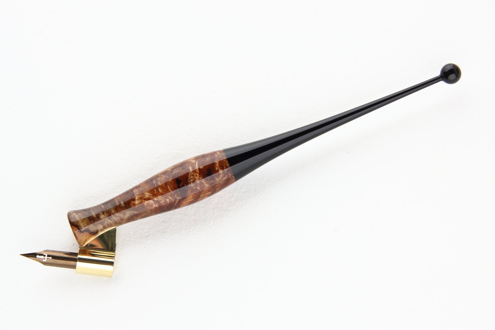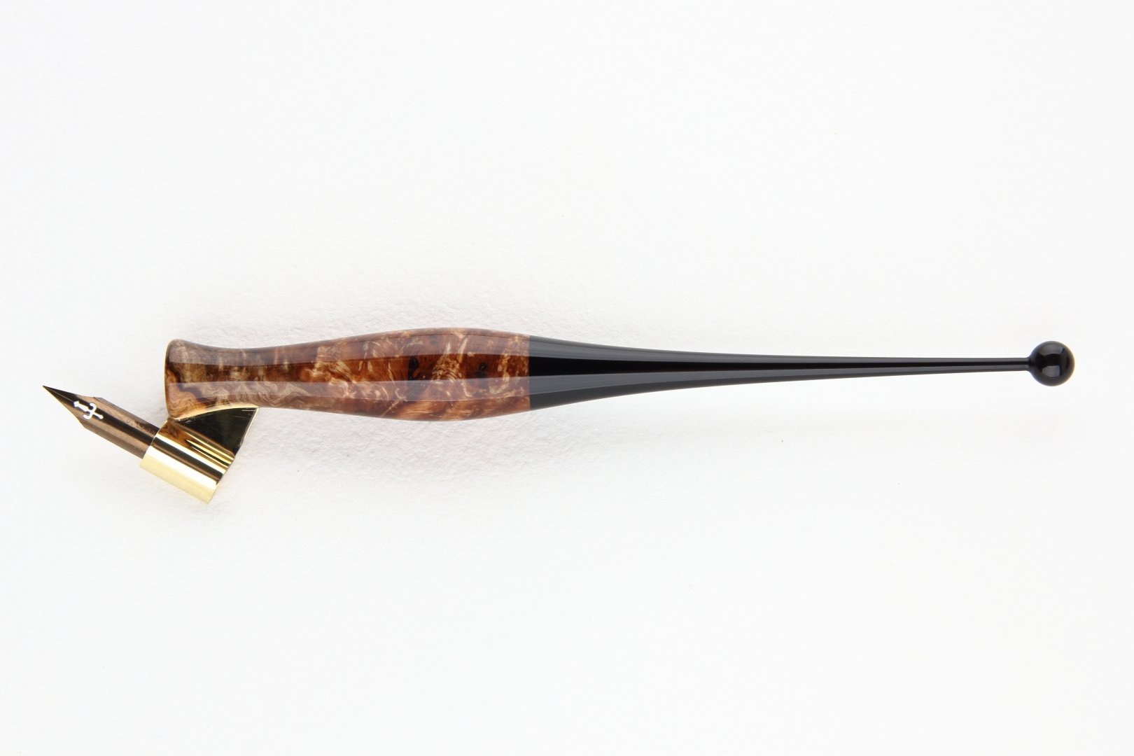 Hand crafted oblique pen holder made of stabilized Alder Burl and Gabon Ebony wood.