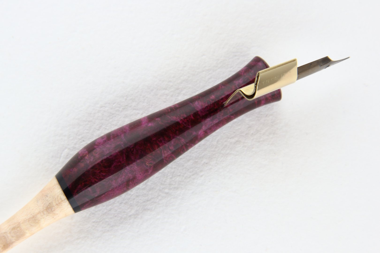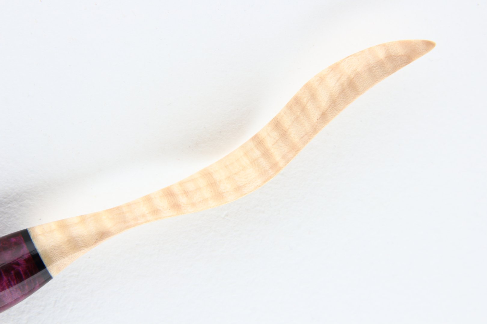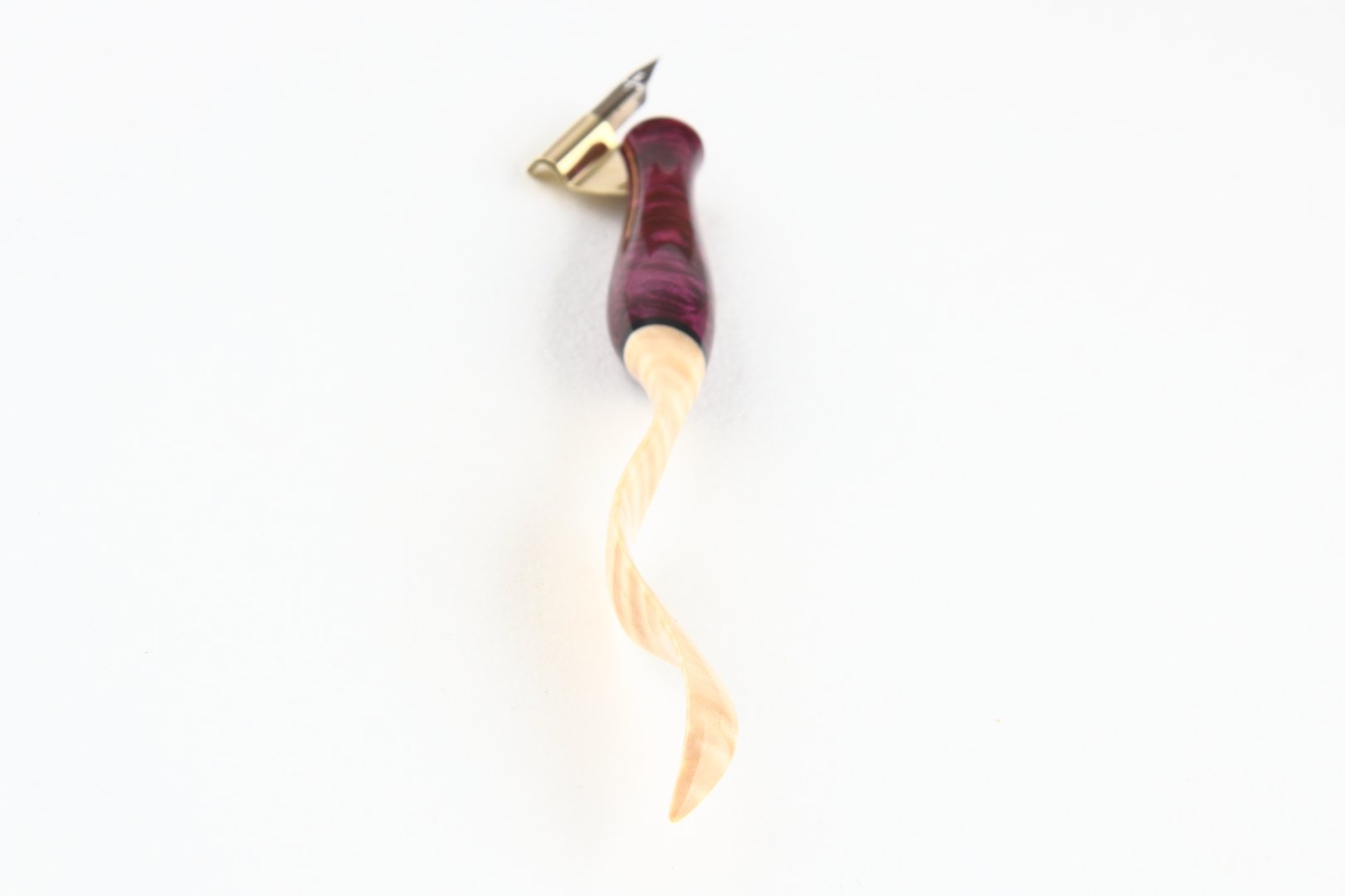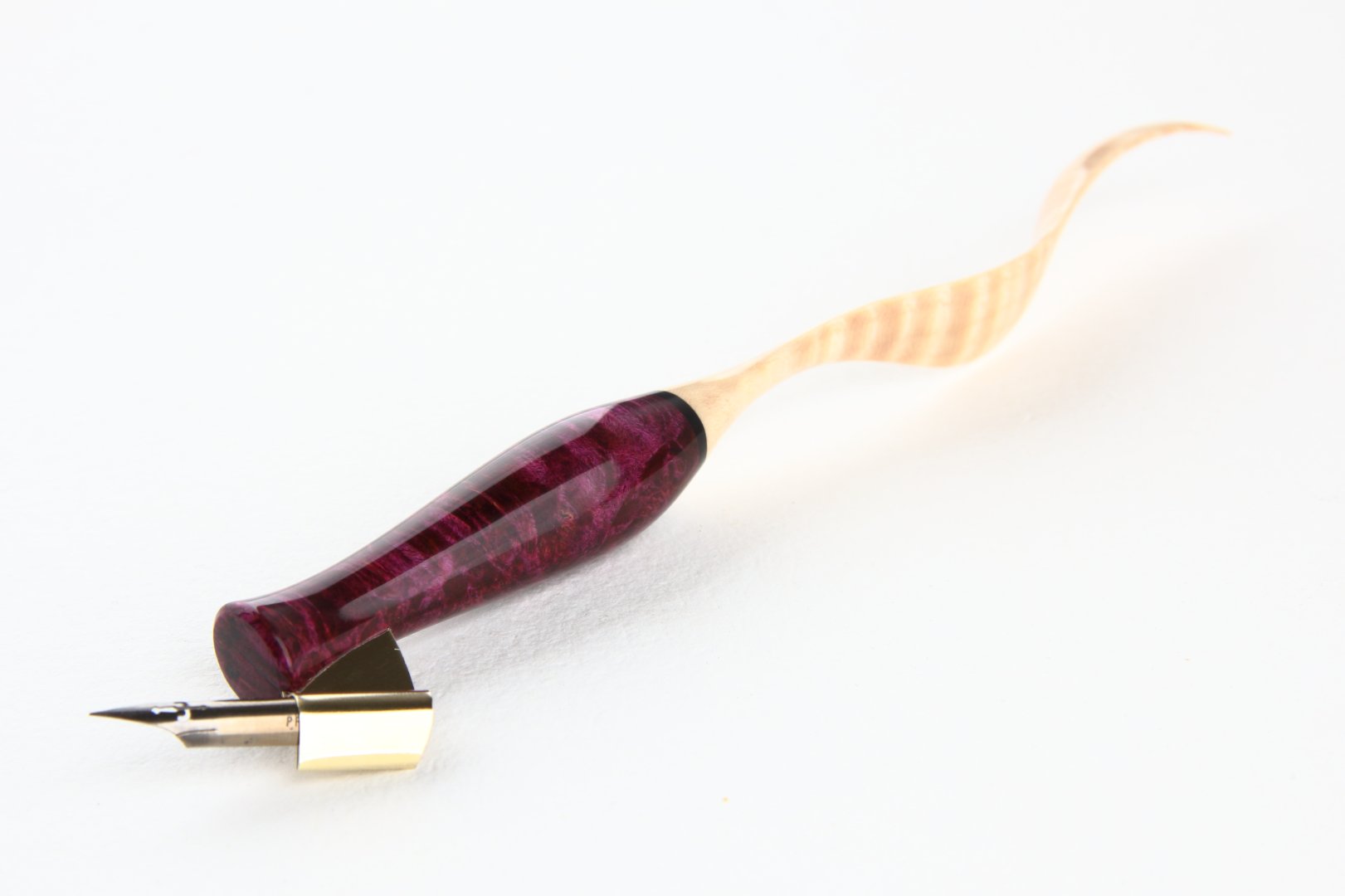 Oblique pen holder with carved tail, made of Stabilized Maple Burl, Gabon Ebony and Curly Sycamore Maple