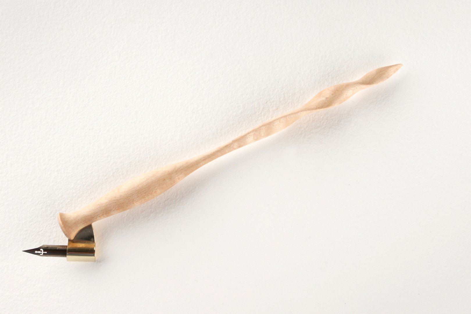 Oblique pen holder with hand carved tail, made of curly Sycamore Maple wood.