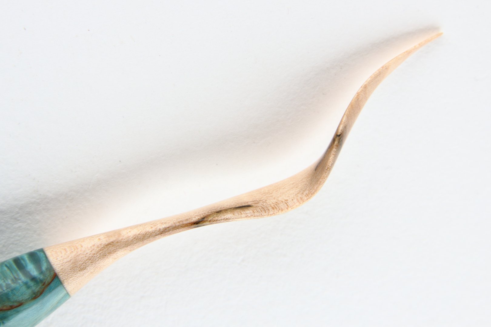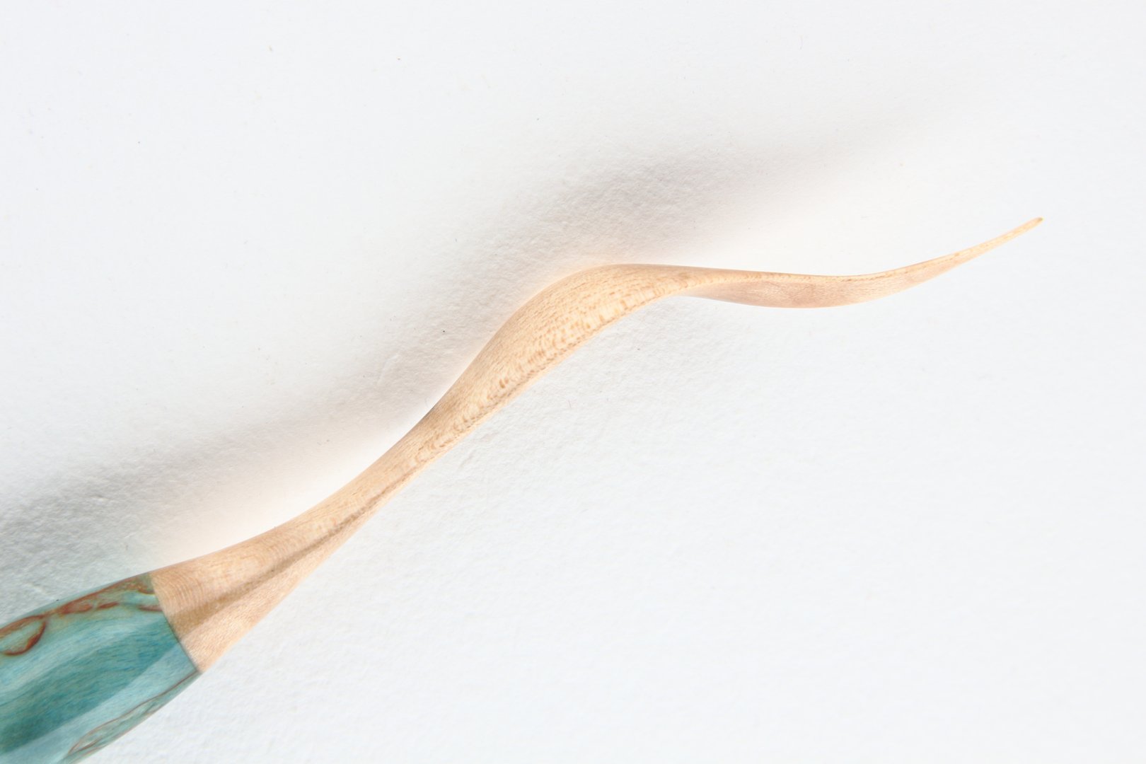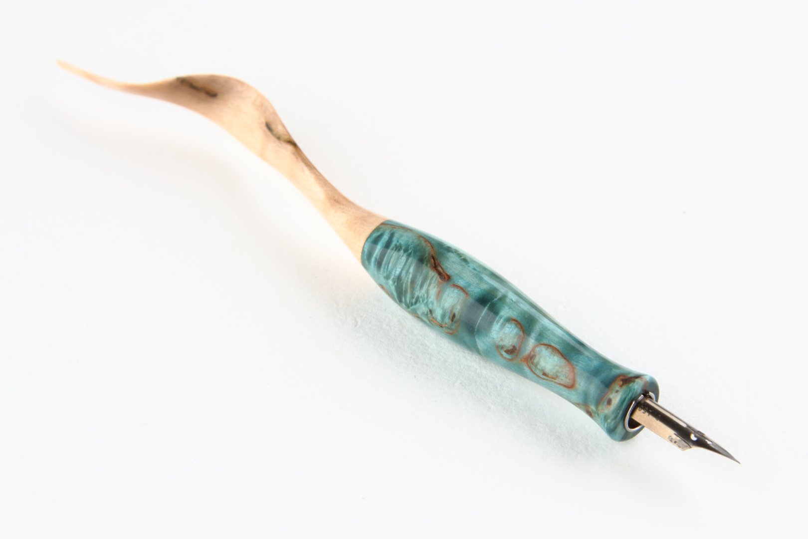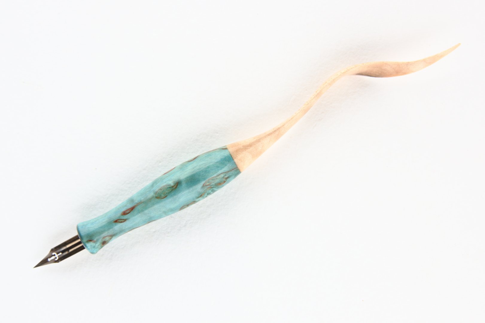 Unique straight pen holder with hand carved tail. Made of Stabilized Karelian Birch and Curly Sycamore Maple.